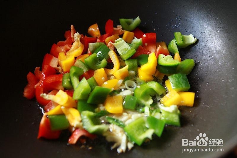 5、在锅里加入胡椒丁,然后翻炒。