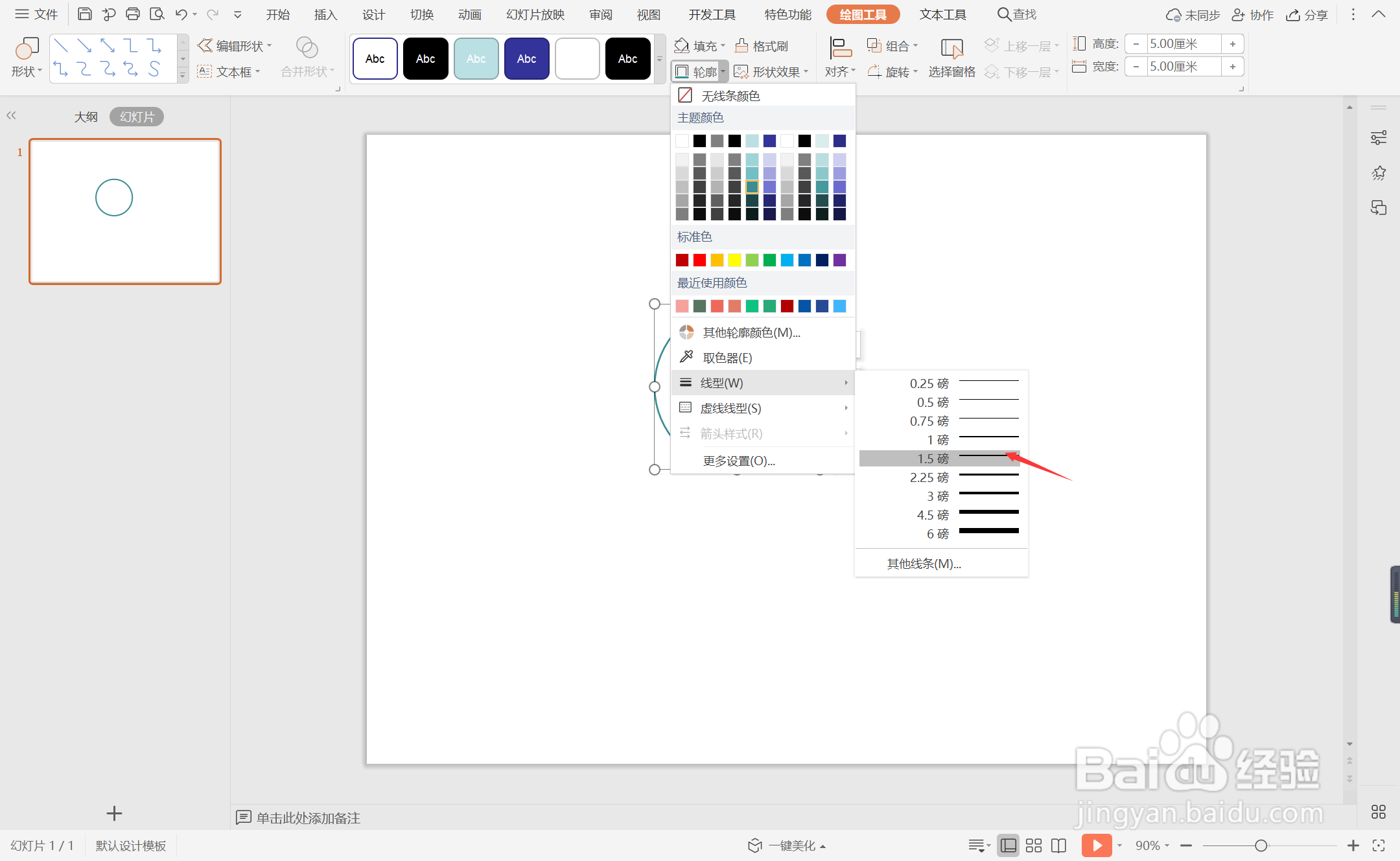 4、点击轮廓,线条颜色填充为蓝色,线条宽度设置为1.5磅。