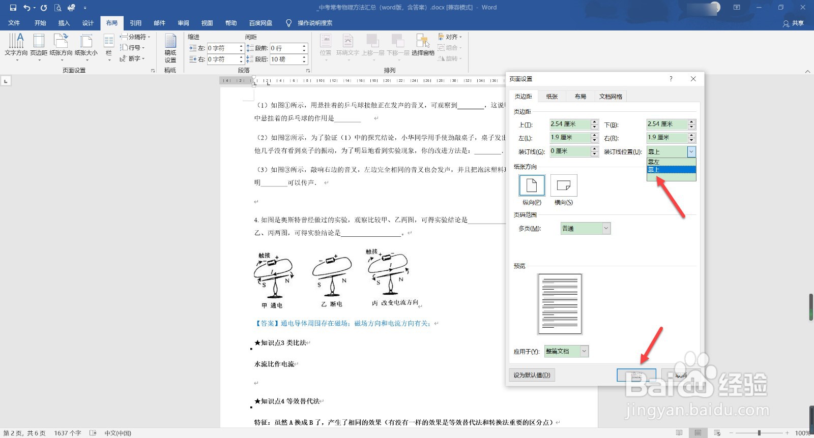3、打开页面设置界面,点击装订线位置后的下拉箭头。
